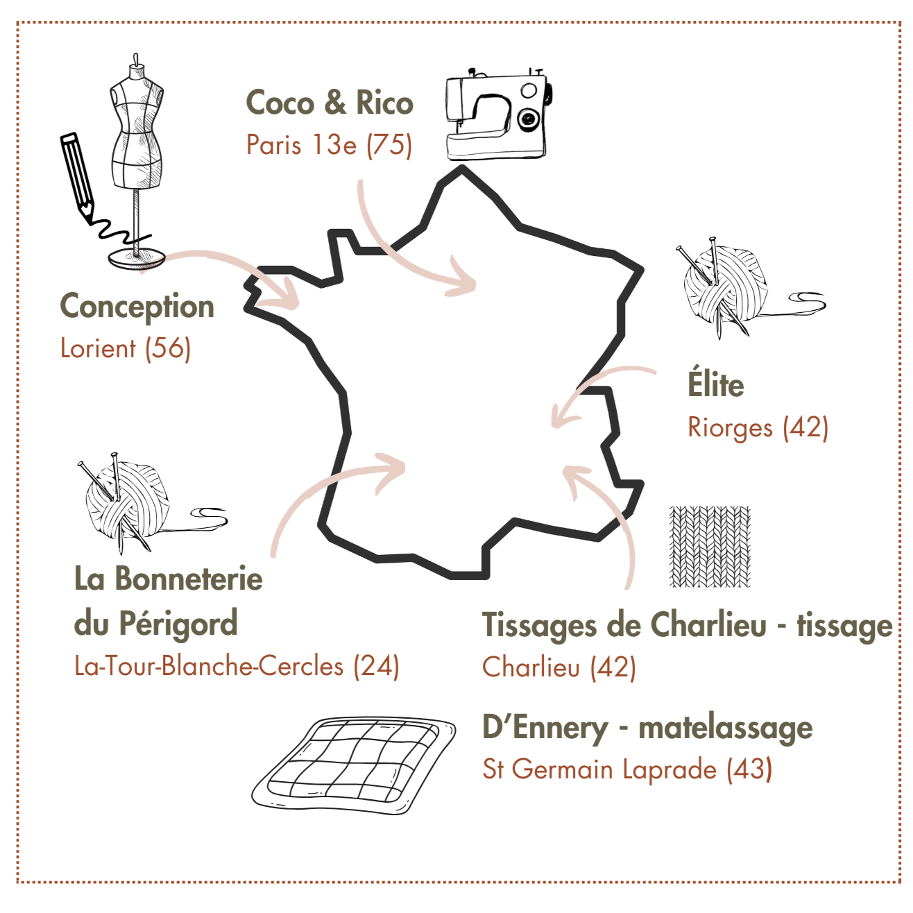 La conception des produits se fait en Bretagne (Lorient), et nos ateliers partenaires sont dans le Périgord, la région lyonnaise et à Paris.