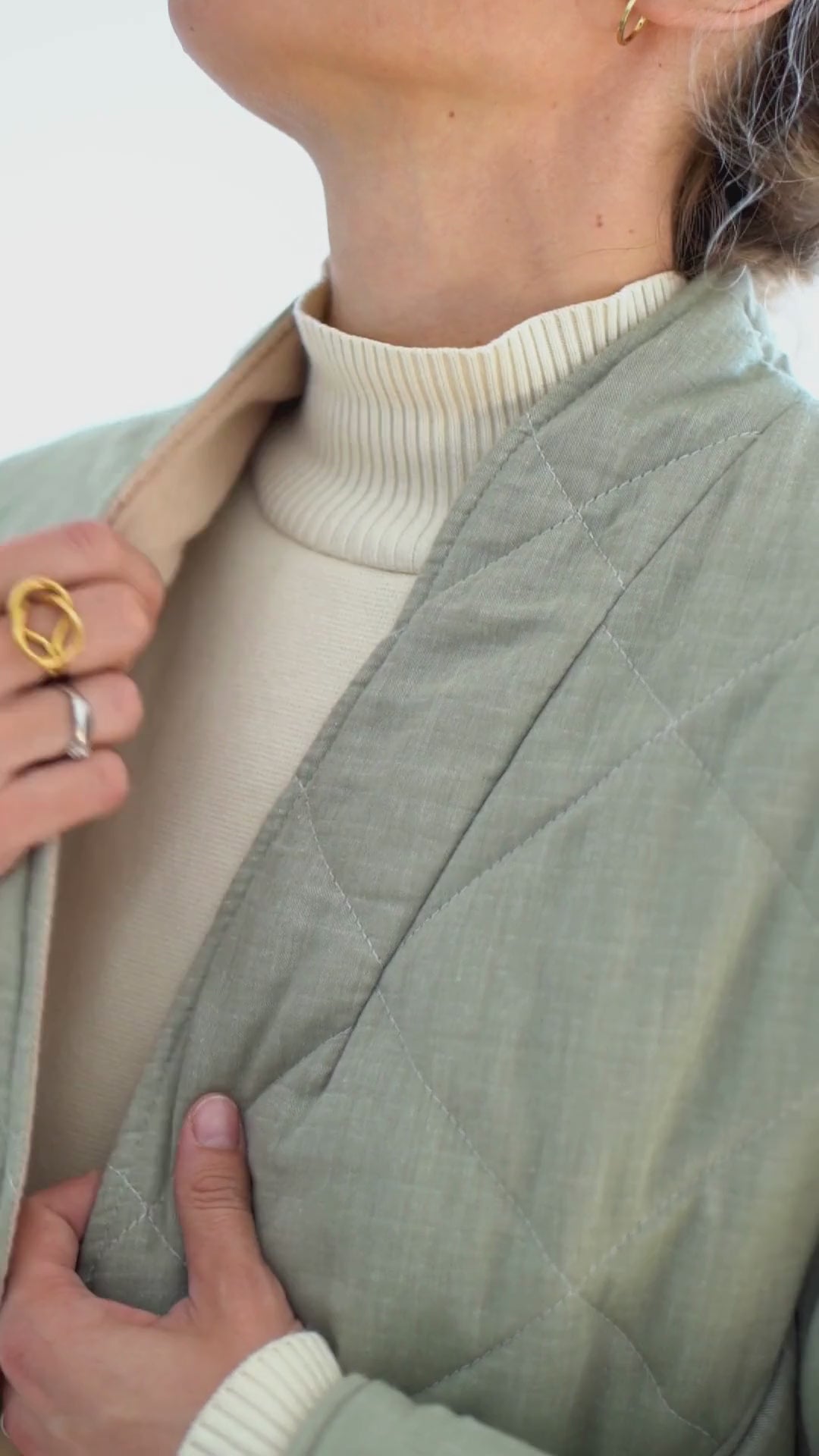 Cette veste est un nuage de douceur qui tient chaud et réconforte, conçue avec des matières ultra douces et respirantes. Elle peut être portée du côté matelassé vert amande, ou du côté non matelassé beige rosé. Sa ceinture amovible permet de l'accessoiriser selon vos envies. Les manches et le col se retroussent pour jouer sur les contrastes.